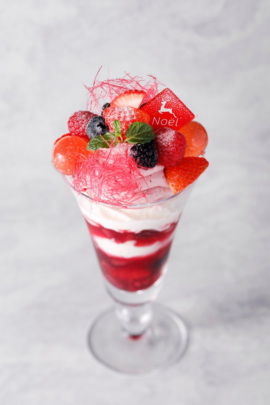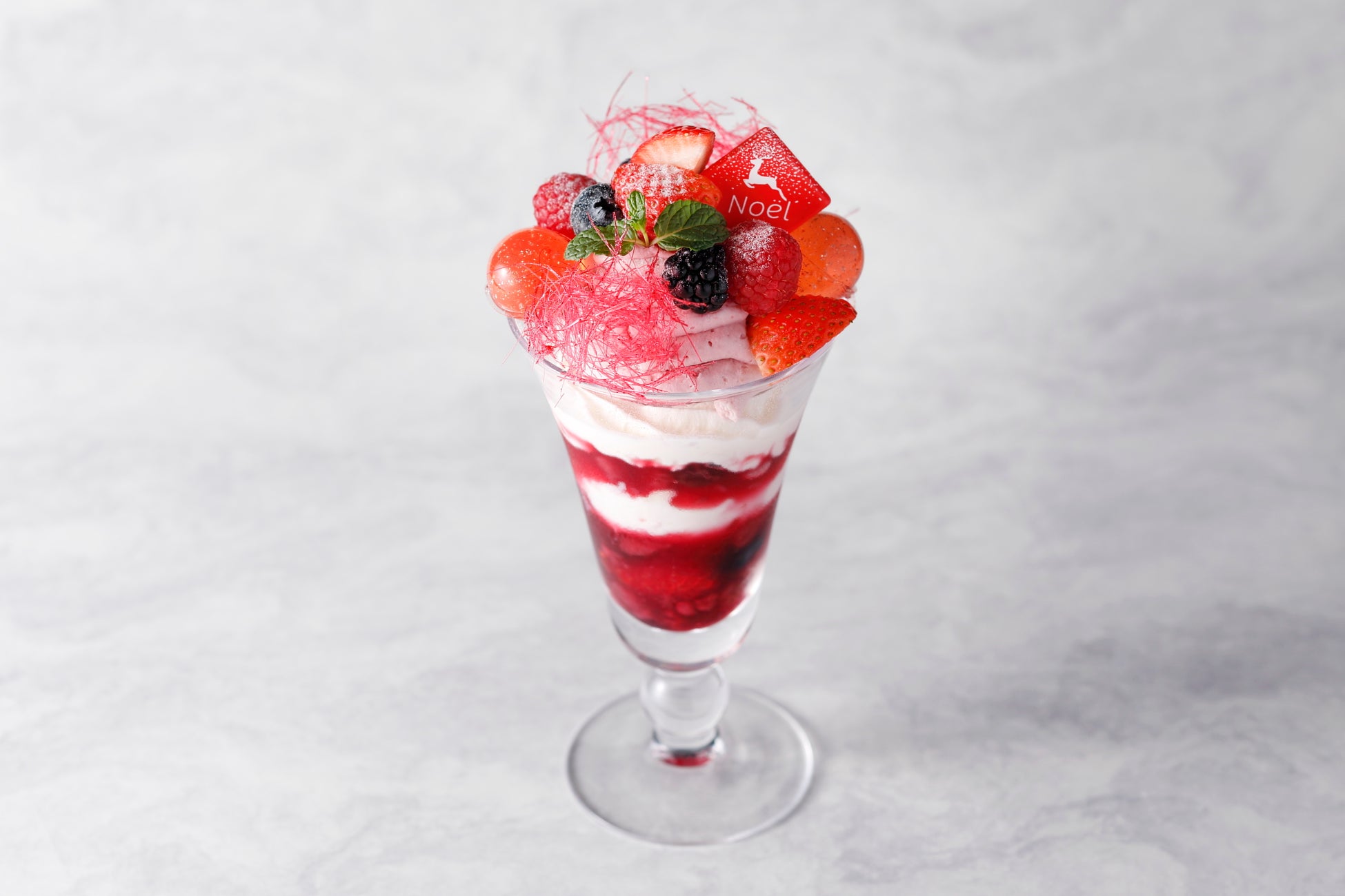 華やかな香りが広がる数種のベリーを贅沢に重ねた、クリスマスパフェです。爽やかなヨーグルトアイスとラズベリーソルベが織りなす甘酸っぱいハーモニーに、クランベリーゼリーのみずみずしい食感がアクセント。ベリーソースが全体を包み込み、心ときめくひとときを演出します。