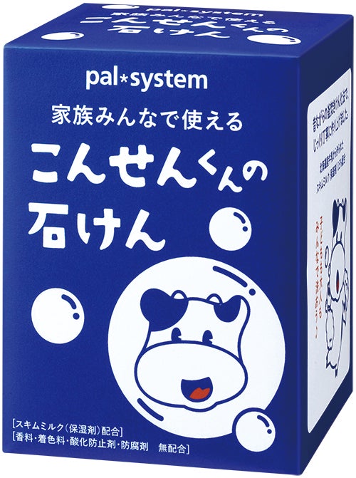 「こんせんくんの石けん」は、ロングセラーのオリジナル商品「こんせんくん石けん」の製造工場の変更に伴い、パッケージを刷新して新登場した商品です。本品は2004年、天然由来油脂の石けん素地に、北海道の牛乳工場で作られたスキムミルク(脱脂粉乳)を保湿成分として配合して開発しました。泡立てた石けんは肌をやさしく包み込み、洗いあがりがさっぱりで、洗顔にも最適です。香料や着色料、酸化防止剤などの防腐剤を使用していないので、子どもから大人まで成分を気にせず使えます。「こんせんくんの石けん」は、紙製の個包装で、オリジナルキャラクター「こんせんくん」のイラスト入りです。1個または箱入りの3個で利用できます。