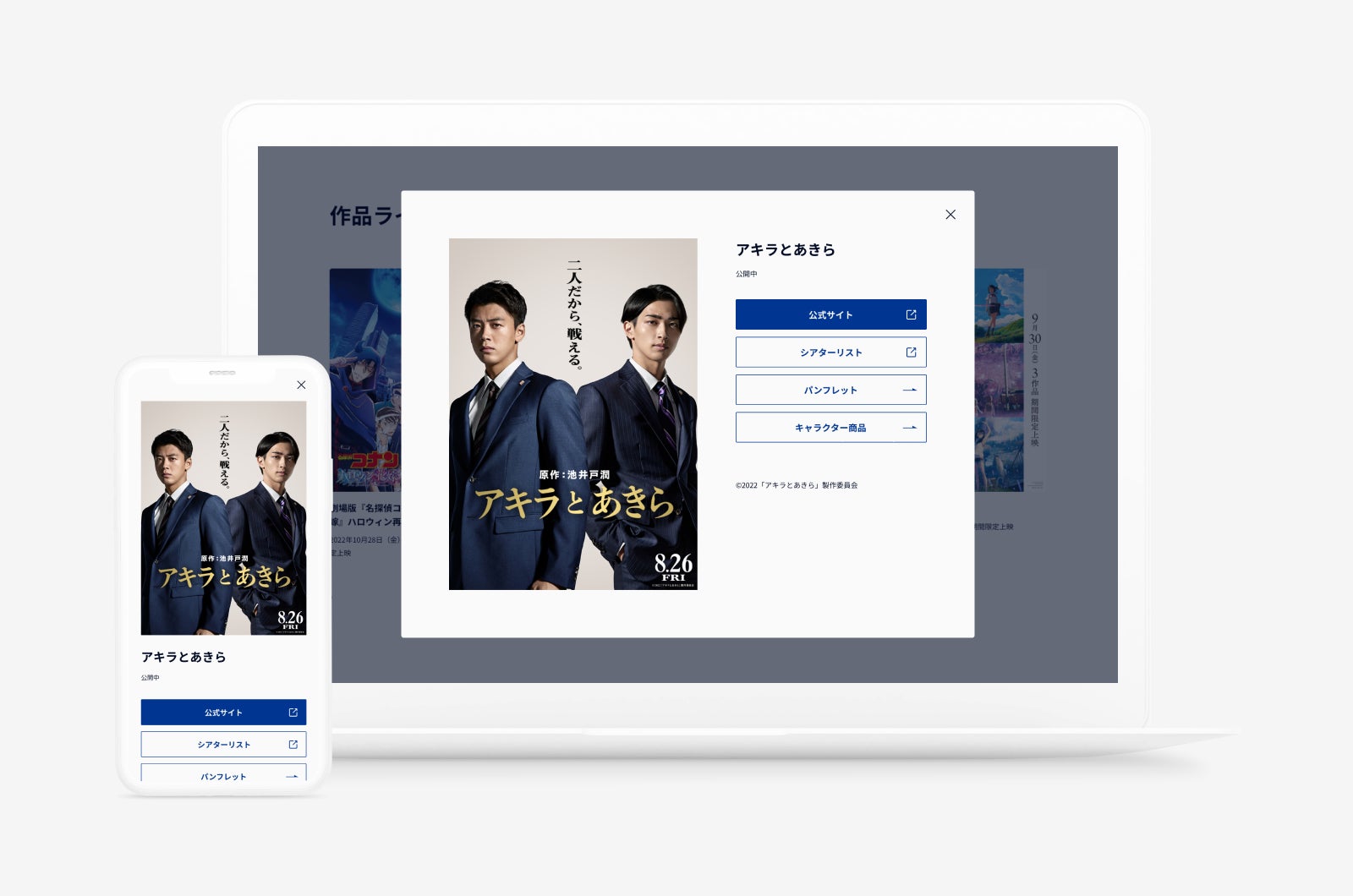 TOPページのファーストビューには、東宝の代名詞でもあるゴジラ作品を用いた動画を制作しました。映画やアニメの作品紹介にも、チラシなどのビジュアルを最大限用いてデザインしました。