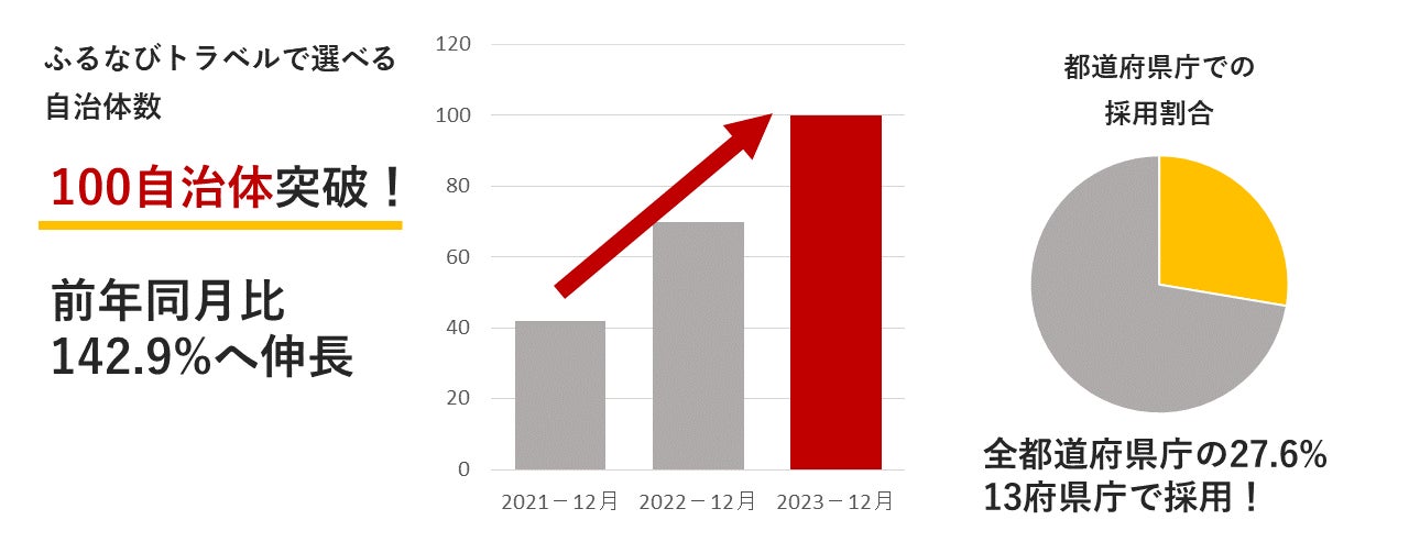 「ふるなびトラベルポイント」の採用自治体数が2023年12月20日に前年同月比142.9%に伸長し、100自治体を突破しました。