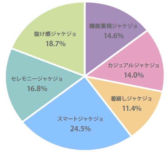 6タイプの中で最もボリュームが高いのは『スマートジャケジョ』です。特に20代に多く、手堅い選択を好むスマートな人柄です。ジャケット選びの際も、予算やトレンド感などのバランスを重視し、試着を行ってから購入する方が多いようです。続いて多いのは、『抜け感ジャケジョ』です。30代以降の管理職が多く、だからこそジャケット選びには「親近感」を求めています。立場上、相手からの視点(自分の見え方)にとても悩んでいることがうかがえます。また、仕事に集中するために「着心地」にもこだわっているようです。
