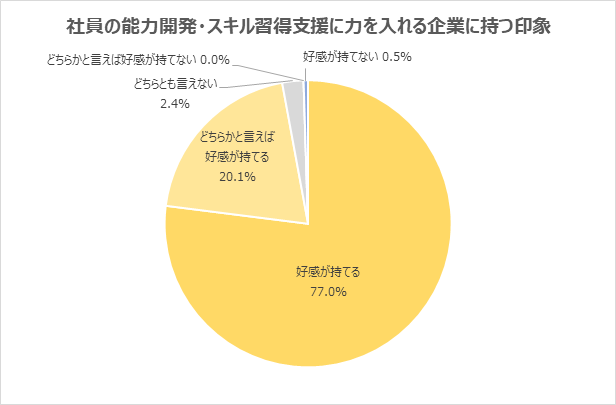 株式会社学情(本社:東京都千代田区)は、20代の仕事観をひも解くために、アンケート調査を実施しました。今回は、「能力開発・スキル習得支援」に関して調査。社員の能力開発・スキル習得支援に力を入れる企業について、「好感が持てる」と回答した20代が77.0%に上りました。「どちらかと言えば好感が持てる」20.1%を合わせると、97.1%の20代が、社員の能力開発に力を入れる企業に好感を持っていることが分かります。また、転職活動において企業の研修やスキル習得支援の内容を「意識する」と回答した20代が93.3%を占めました。「リスキリングへの関心が高まっているので、注目している」「能力開発やスキル習得支援をPRする企業が増えているので、実際の内容まで意識している」「VUCAの時代は、学び続けることが必要だと思う」などの声が上がっており、関心の高さが伺えます。