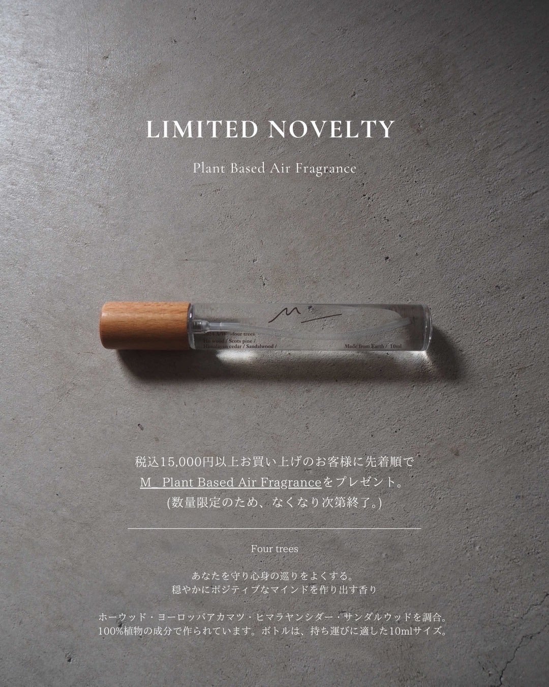 税込15,000円以上お買い上げのお客様に、M_ Plant Based Air Fragranceをプレゼント。(数量限定のため、なくなり次第終了。)