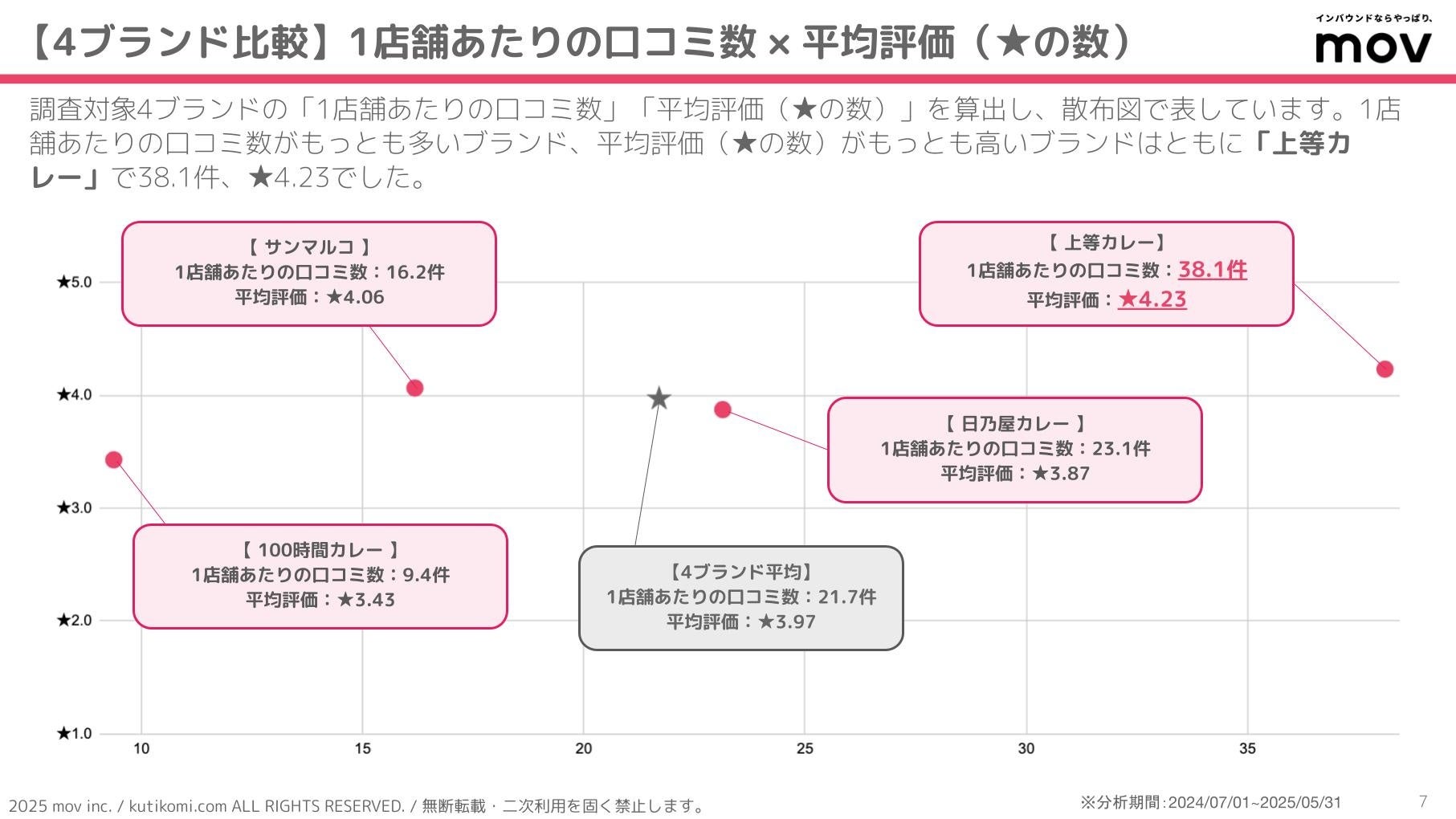 こちらの散布図では、調査対象4ブランドの「1店舗あたりの口コミ数」「平均評価(★の数)」を算出しています。1店舗あたりの口コミ数がもっとも多いブランド、平均評価(★の数)がもっとも高いブランドはともに「上等カレー」で38.1件、★4.23でした。