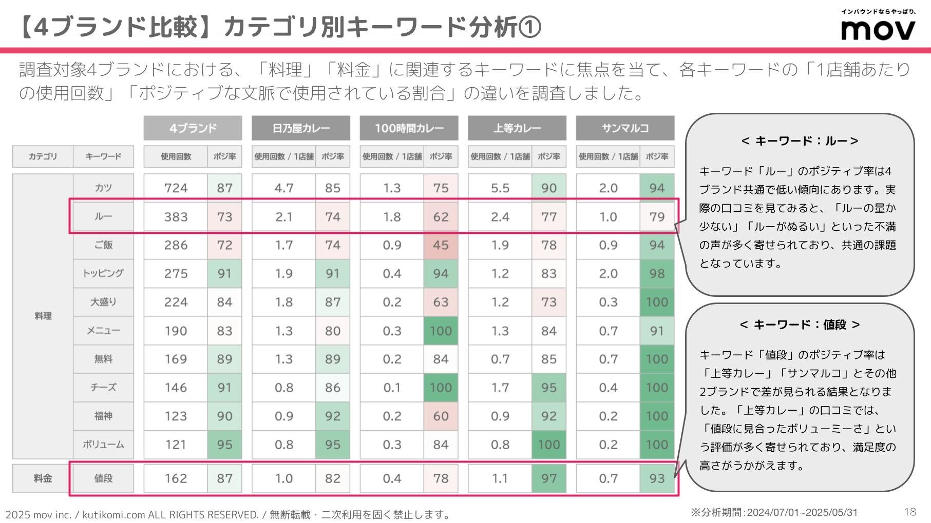 こちらの表では、調査対象4ブランドにおける、「料理」「料金」に関連するキーワードに焦点を当て、各キーワードの「1店舗あたりの使用回数」「ポジティブな文脈で使用されている割合」の違いを調査しています。