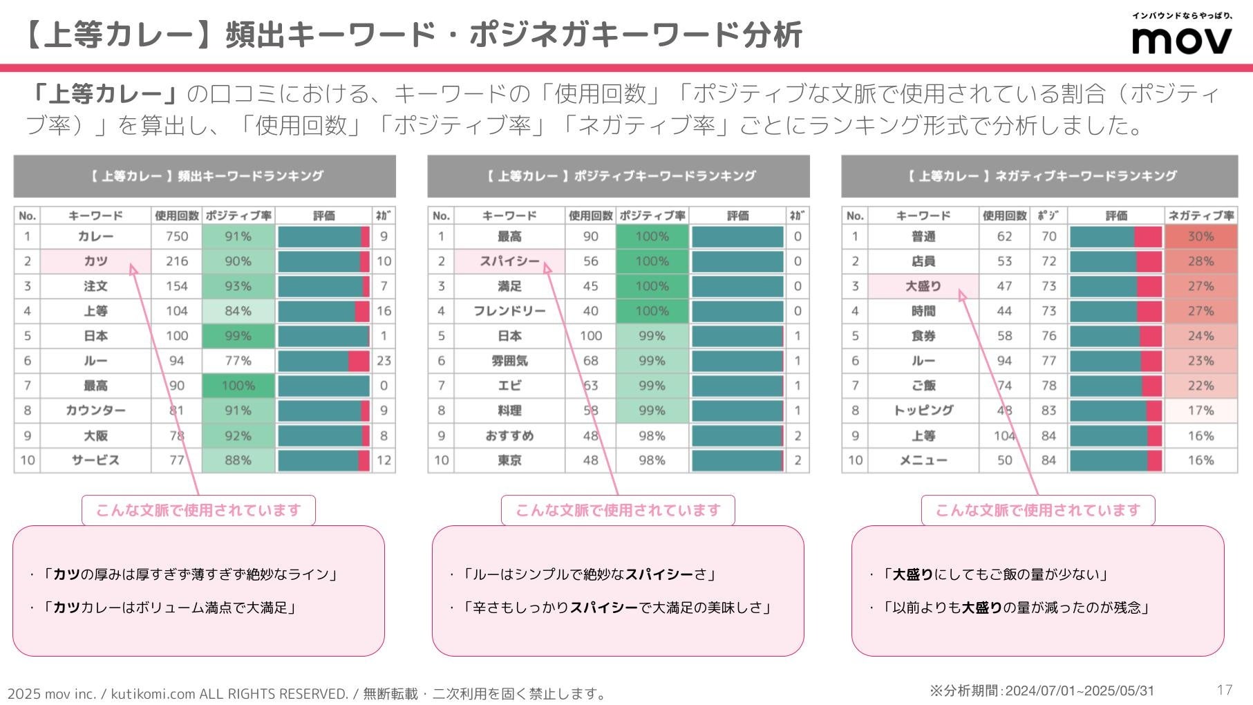 こちらの表では、「上等カレー」の口コミにおける、キーワードの「使用回数」「ポジティブな文脈で使用されている割合(ポジティブ率)」を算出し、「使用回数」「ポジティブ率」「ネガティブ率」ごとにランキング形式で分析しています。