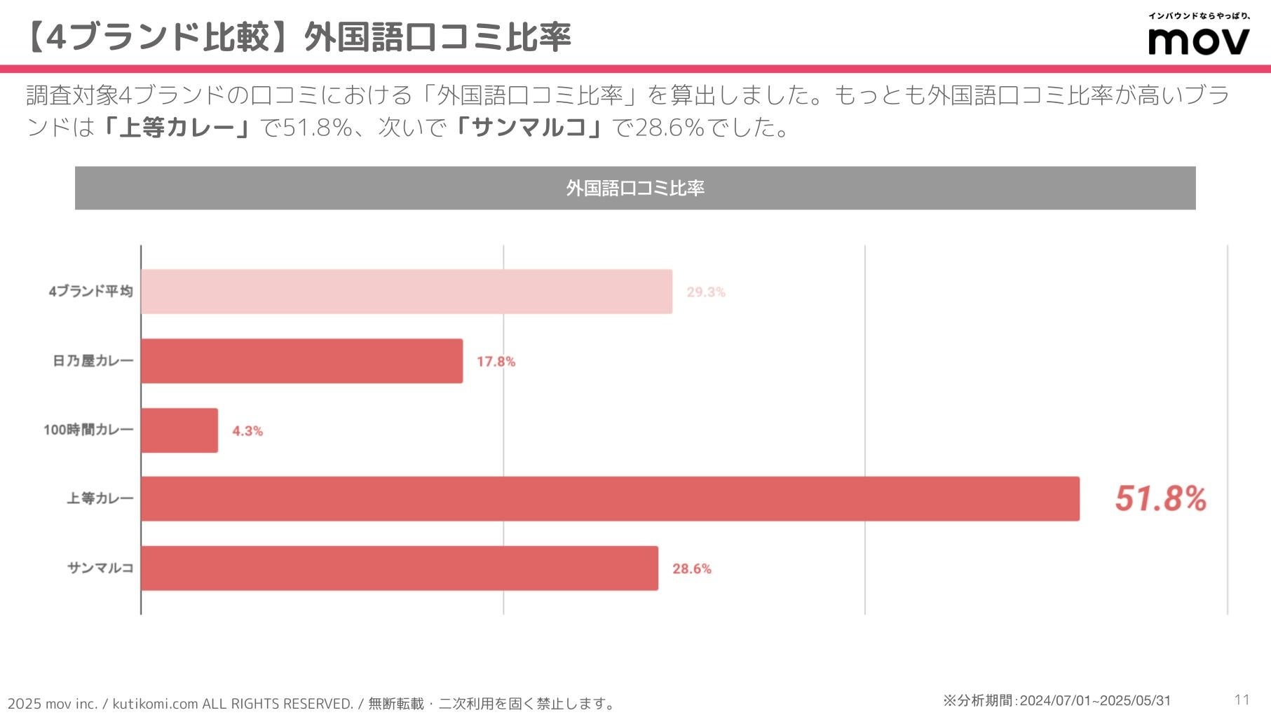 こちらのグラフでは、調査対象4ブランドの口コミにおける「外国語口コミ比率」を算出しています。もっとも外国語口コミ比率が高いブランドは「上等カレー」で51.8%、次いで「サンマルコ」で28.6%でした。