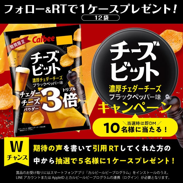 カルビー「サッポロポテト」公式Twitterアカウント(@CalbeeSapporoCP)をフォローの上、当該投稿をリツイートした方の中から抽選で10名様に「チーズビット 濃厚チェダーチーズブラックペッパー味」1ケース(12袋)をプレゼントします。さらに、Wチャンスとして、「本商品への期待の声」とともに引用リツイート投稿した方の中から抽選で5名様に「チーズビット 濃厚チェダーチーズブラックペッパー味」1ケースをプレゼントします。