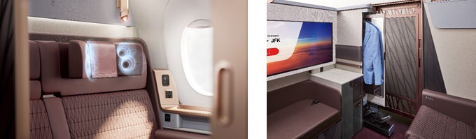 ・機内エンターテインメントシステムをさらにお楽しみいただけるよう、世界で初めてヘッドフォン不要のヘッドレスト内蔵スピーカーを導入し、ベッドモードでも快適に視聴ができるヘッドレストのリクライニング機能も装着