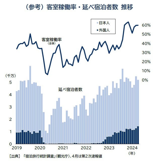 観光庁によれば、2024年4月に国内のホテルや旅館に泊まった日本人・外国人の総数は前年同月比10.1%増の延べ約5190万人泊だった。なかでも、外国人は同46.9%増・約1450万人泊に上り、訪日客の急増ぶりが目立った。また、客室稼働率も全体で59.8%と、コロナ前に迫る高い水準で推移した。1ドル150円を超える円安で割安感のある日本旅行が人気となっていることを追い風に、国内の旅館・ホテル市場は今後も好調を維持するとみられ、24年度の市場は5年ぶりに5兆円台に到達し、過去最高を更新する可能性もある。