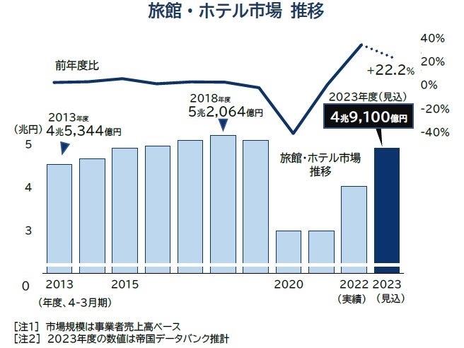 2023年度の「旅館・ホテル市場」、コロナ前並みの4.9兆円 訪日客増・値上げが寄与