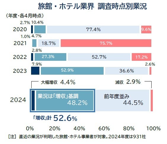 過去1年間に帝国データバンクが調査した全国の旅館・ホテル業者のうち、直近の業況が判明した931社を集計した結果、52.6%の企業が「増収」基調であることが分かった。ただ、「増収」の割合は1年前の23年4月(60.8%)に比べると低下し、代わって「前年度並み(横ばい)」(44.5%)が増加した。「減収」割合は2.9%と、1年前(2.6%)に比べほぼ横ばいで推移したほか、コロナ禍中の21年4月(75.7%)から大幅に減少した。