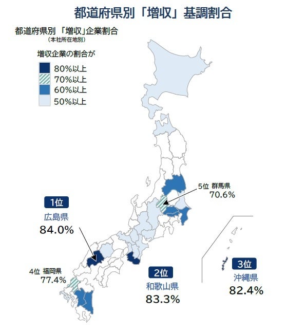 都道府県別にみると、「増収」基調となったホテル・旅館の割合が最も高かったのは「広島県」で、84.0%の企業が増収基調と回答した。「和歌山県」「沖縄県」でも8割超の企業で増収となったほか、特にアジアからのビジネス客・訪日客の存在感が目立つ「福岡県」、草津温泉など関東有数の温泉コンテンツを有する「群馬県」では、「増収」企業が7割を超えた。