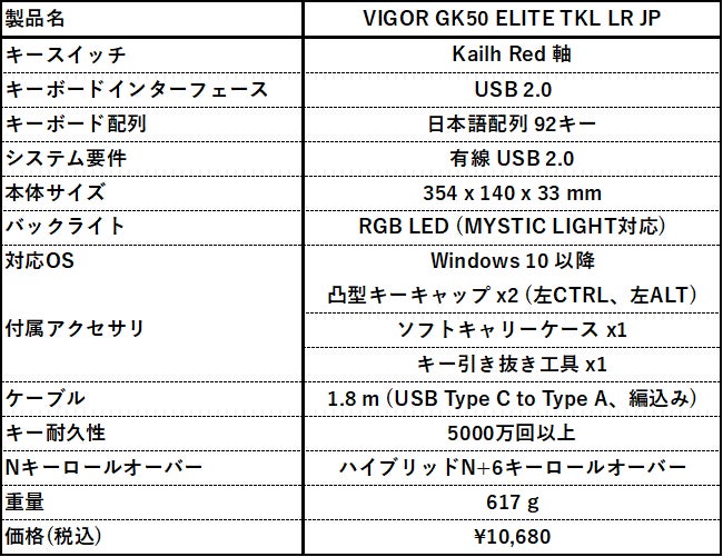 【VIGOR GK50 ELITE TKL LR JPの主な特徴】