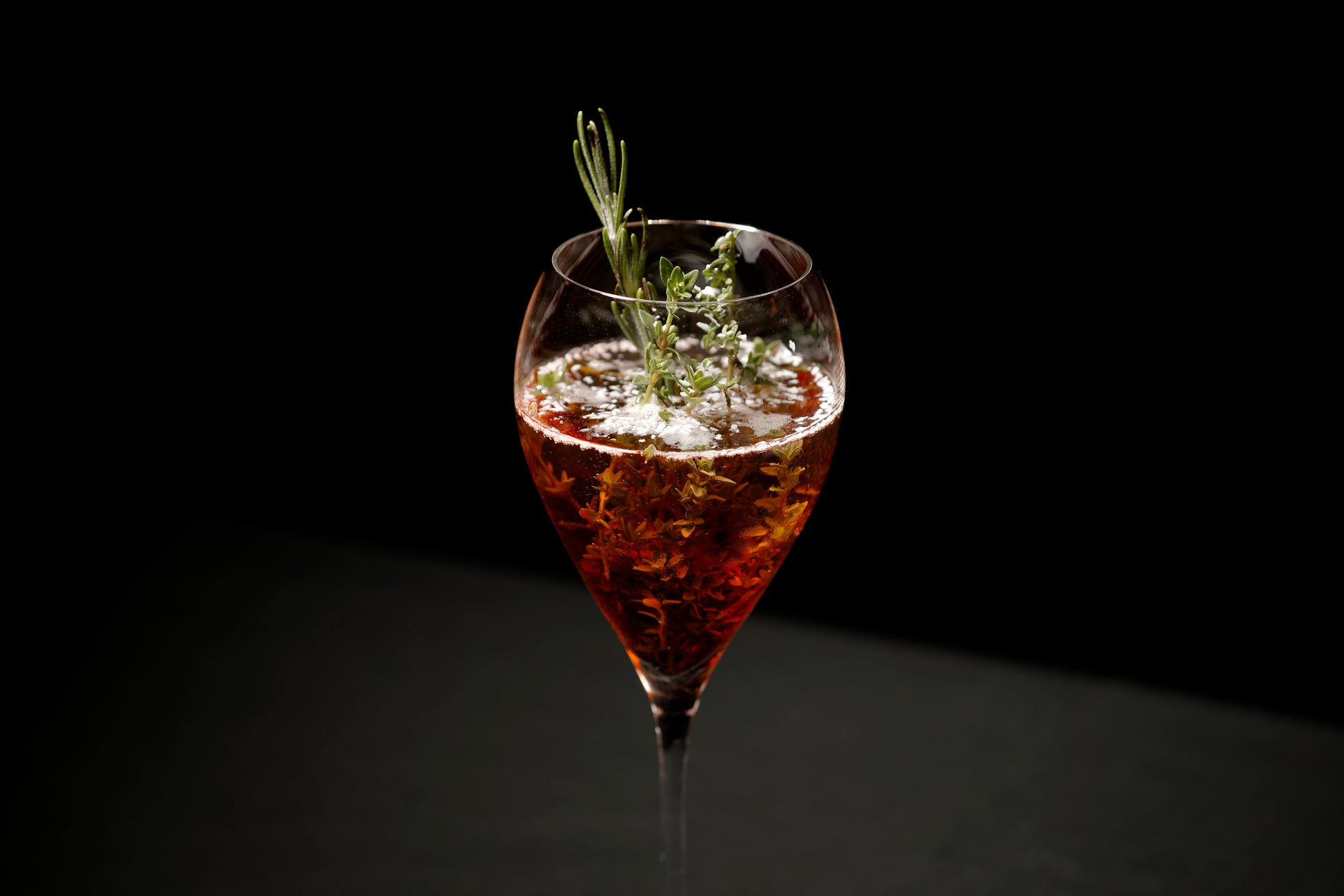 「TENJIN」ザ バーでは、クリスマスディナーの食前酒や食後のひとときにお楽しみいただけるボタニカルカクテル「ジョワイユ ノエル」をご用意しました。奈良県産の苺「古都華」の華やかな香りと甘み、フレッシュな酸味をいかしたリキュールと、清々しいエルダーフラワーを合わせました。美しいルビー色に満たされたグラスを、永遠の愛や命を象徴する常緑のハーブが彩ります。こちらのカクテルは、モクテルでのご用意も承ります。