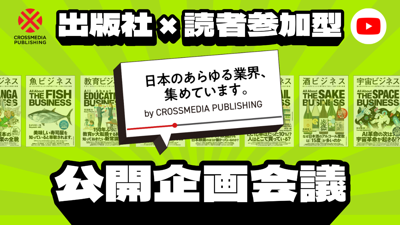 ビジネス書や実用書を中心に出版するクロスメディアグループ株式会社(本社: 東京都渋谷区千駄ヶ谷、代表取締役:小早川幸一郎)は、2025年2月5日(木)、視聴者の皆さんと一緒に新しいビジネス書のアイデアをつくっていくオンラインイベント「読者参加型 ○○ビジネス企画出し YouTube LIVE」を開催します。