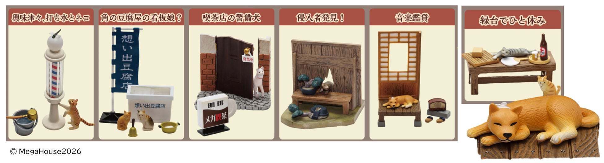 昭和を代表する街の風景とそこで暮らす動物たちのジオラマフィギュア。喫茶店や縁台、豆腐屋など、昭和の暮らしが思い出されるラインアップです。