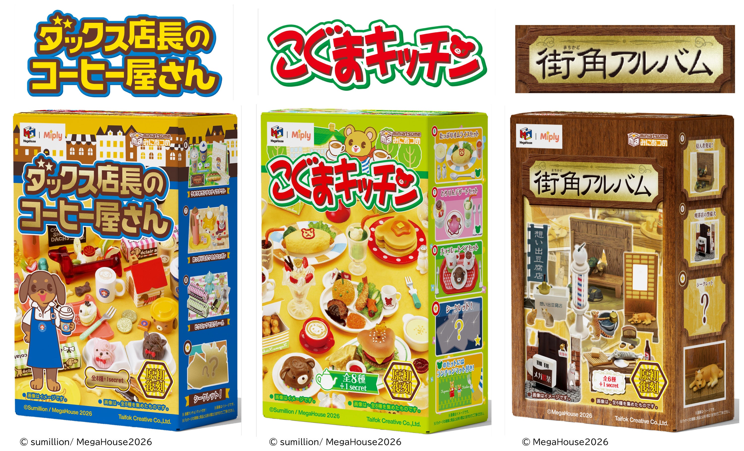 株式会社メガハウス(バンダイナムコグループ/本社:東京都千代田区)は、ミニチュアフィギュア、『みにあつめ』シリーズ第1弾、「ダックス店長のコーヒー屋さん」「こぐまキッチン」「街角アルバム」(全3商品)を2026年11月下旬より発売いたします。