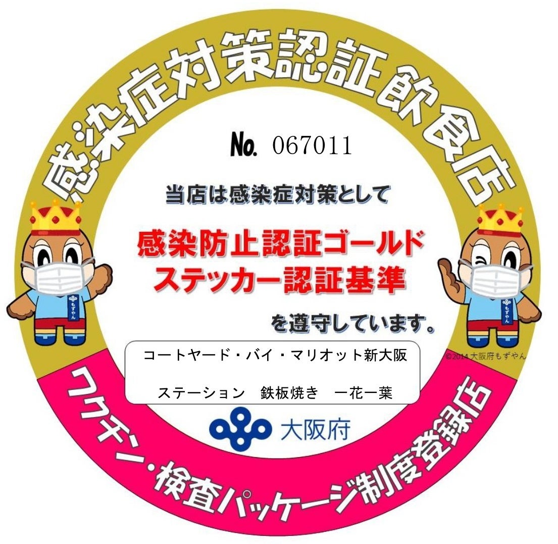 コートヤード・バイ・マリオット 新大阪ステーションでは、すべてのお客様の健康と安全を最優先に「三密回避」「徹底した衛生管理」「従業員の健康管理」に取り組む当社ガイドラインを遵守し、ホテル運営を行っております。レストラン&バーでは、大阪府が推奨する「感染に強い飲食店に向けて」の取り組みを実施し、「感染対策が取られているお店」としてのチェック項目をクリアいたしております。