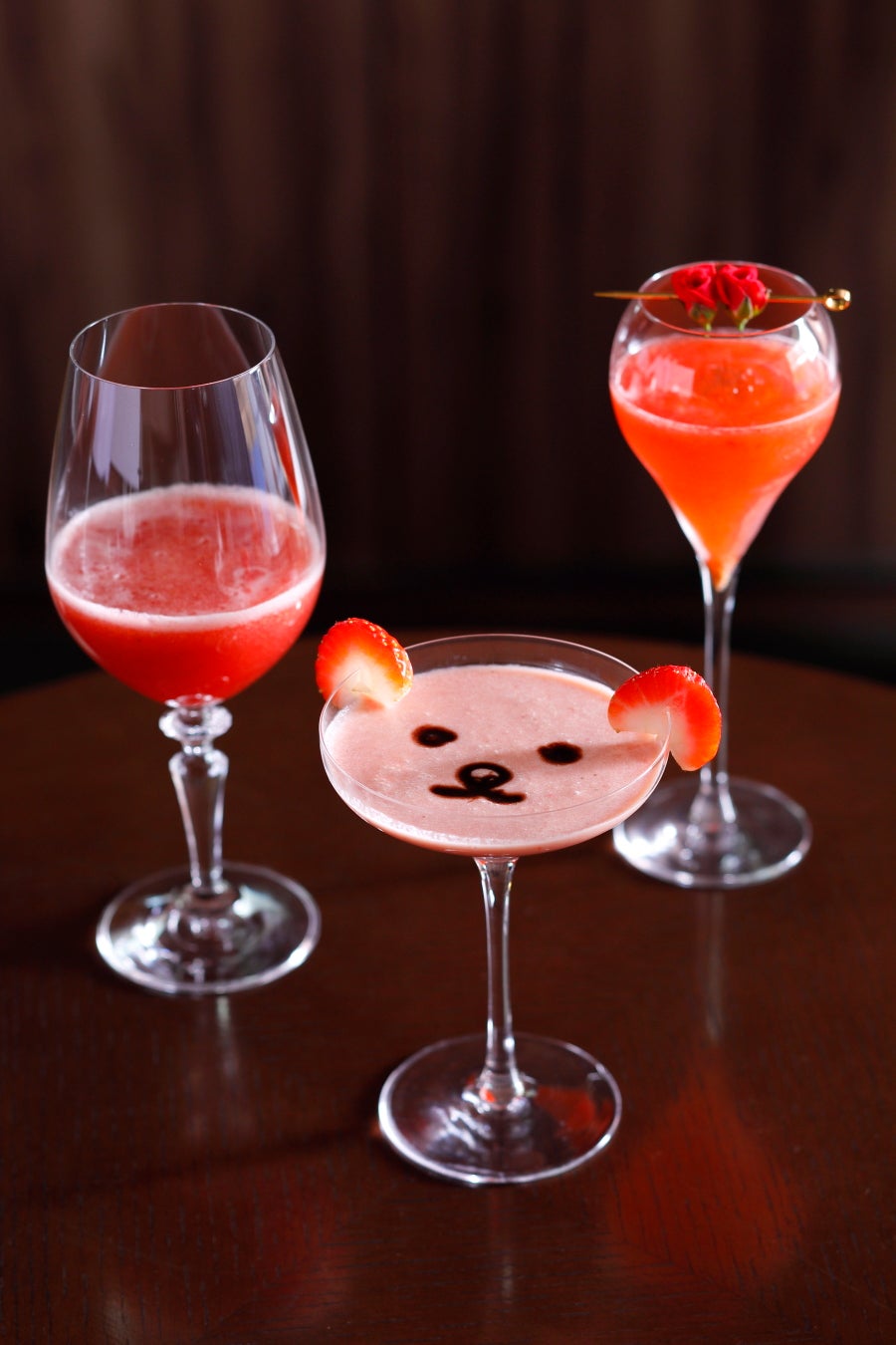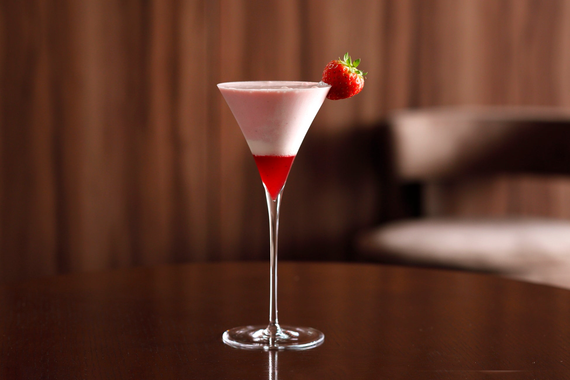 クランベリージュースに、フレッシュなクリームやミルクを重ね、新鮮な苺を飾った華やかで愛らしい一杯です。