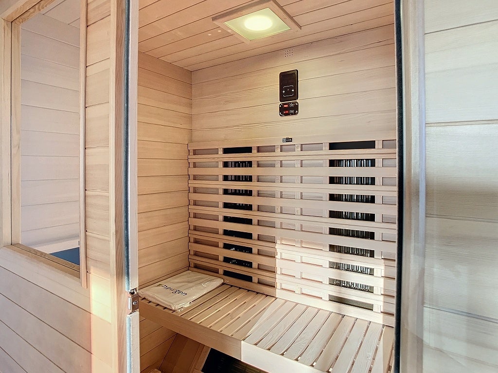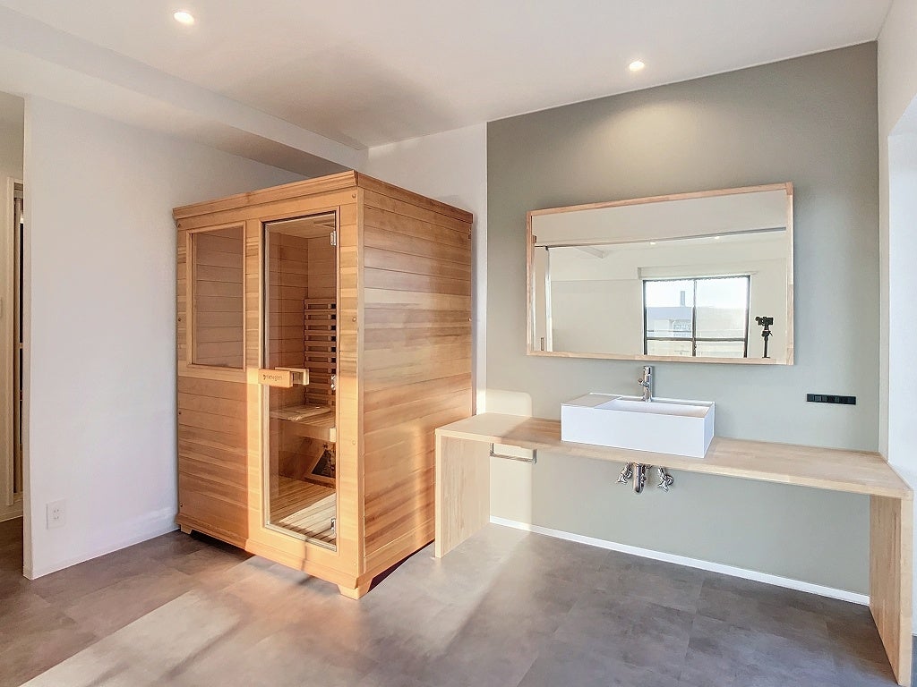 低温で身体への負担が少なく、長時間入ることのできる赤外線サウナを設置。本体のサイズは、一畳以下の省スペースなものを採用。2人用サウナなので友人や家族と一緒に疲れた体と心を癒す、贅沢なプライベート時間をお楽しみください。