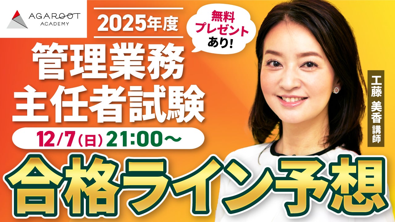 株式会社アガルート(本社:東京都新宿区、代表取締役:岩崎 北斗)が運営する「アガルートアカデミー」は、管理業務主任者試験当日の12月7日(日)に 「解答速報」、「総評動画YouTubeLIVE配信」「合格ライン・合格点予想動画YouTubeLIVE配信」を無料で実施いたしました。