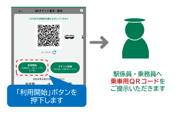 お客さまご自身でえきねっとアプリにて、ご利用開始の操作(セルフチェックイン)を実施いただき、駅係員・乗務員等へご提示ください。