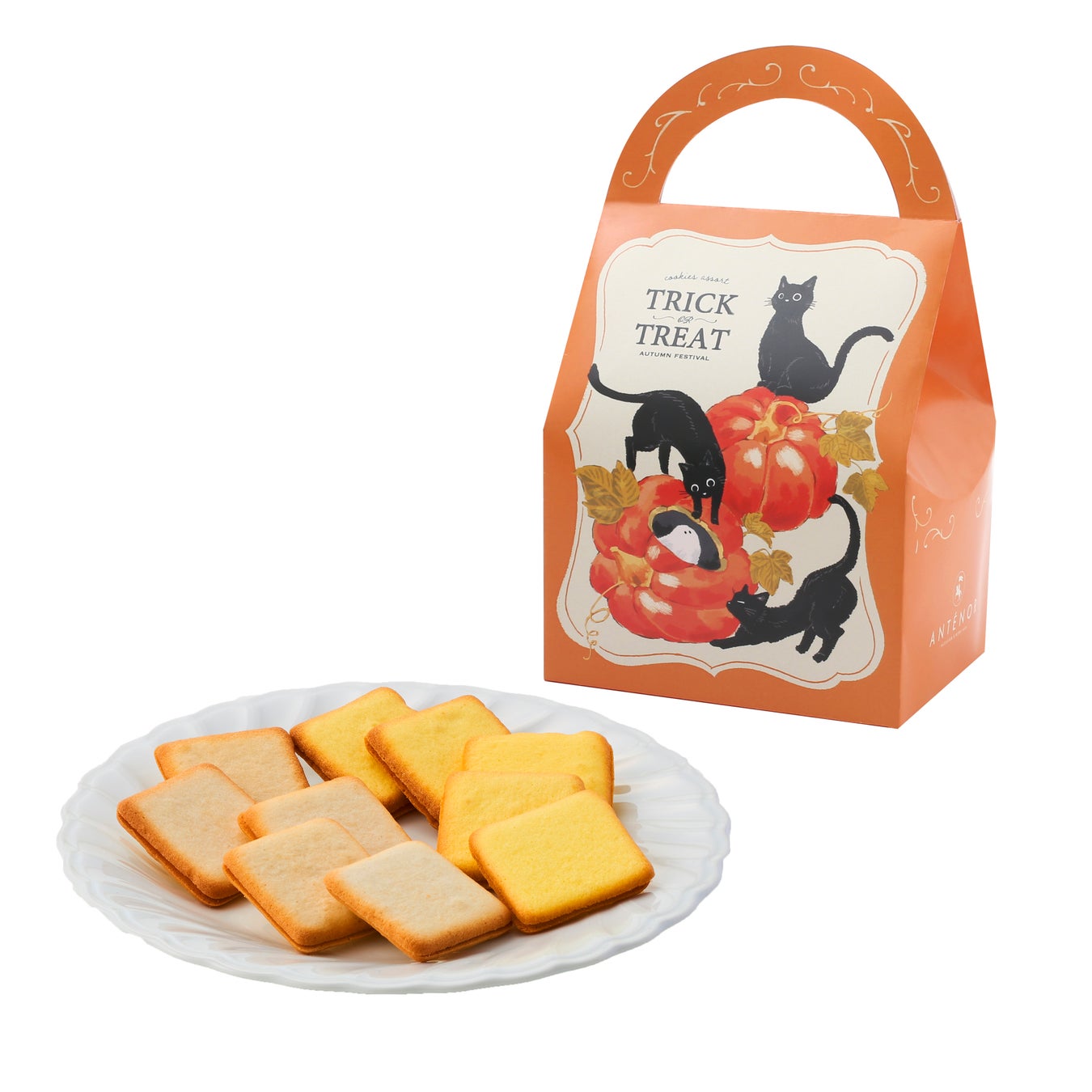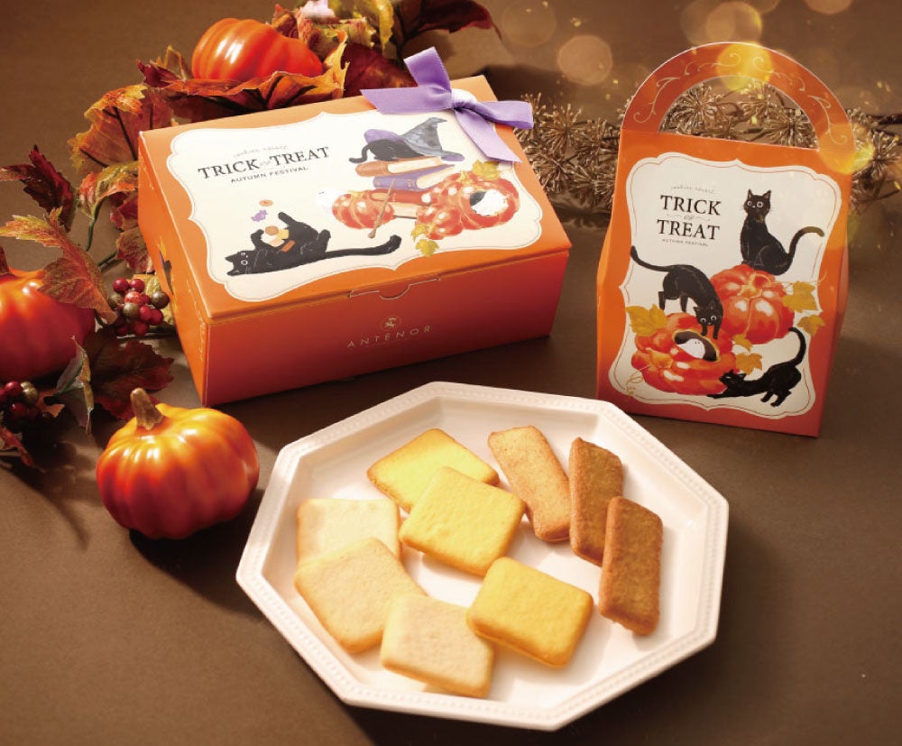 また店頭とオンラインショップ(https://www.antenor.jp/shopping/)では『いたずらネコと可愛いおばけ』をテーマに描いたハロウィン限定パッケージのクッキー詰め合わせを販売中です。