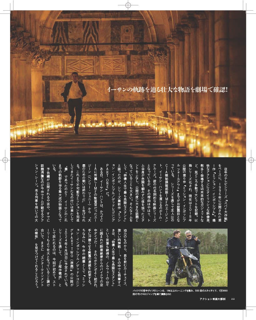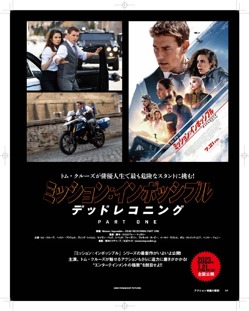 本書は公開前の「ミッション:インポッシブル デッドレコニングPART ONE」の見どころから四半世紀続く「ミッション:インポッシブル・シリーズ」の過去作を大特集。稀代のアクション俳優、トム・クルーズの魅力をあますことなく紹介している。