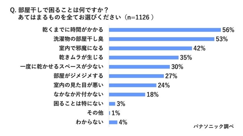 一方、天候・時間帯に左右されないものの、部屋干しで困ることとしては、「乾くまでに時間がかかる」(56%)、「洗濯物の部屋干し臭」(53%)、「室内で邪魔になる」(42%)がTOP3となりました。