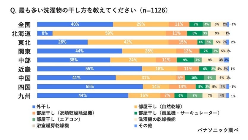 洗濯の工程の中でも時間がかかるのが“乾燥”。最も多い洗濯物の干し方については、全国平均で見ると「外干し」(40%)、「部屋干し(自然乾燥)」(29%)、「部屋干し(衣類乾燥除湿機)」(11%)がTOP3の結果になりました。しかし、地域別に見ると、「外干し」は北海道では8%、東北では26%と全国平均と比較するとかなり低く、一方で近畿・四国では55%という結果に。降雪地域ほど「外干し」率は低くなるなど、洗濯物の干し方には地域性が色濃く反映されることがうかがえます。