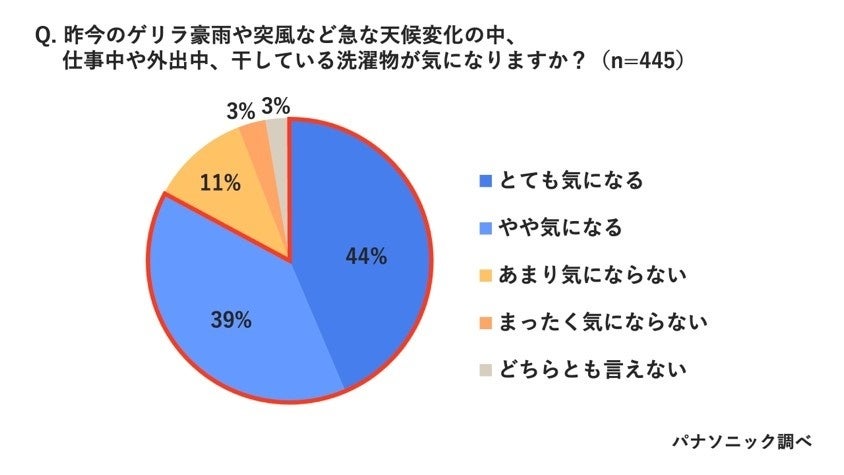 部屋干しが増えていることからもわかる通り、外干しは天候・時間帯に左右されるのがデメリット。昨今の急な天候変化などで、「仕事中や外出中、干している洗濯物が気になる」と回答した方は83%にものぼります。外干し率が高い中で、仕事中や外出中にも気にかけなければならないという精神的に拘束される時間も、身体的な拘束時間とあいまって洗濯の拘束時間の長さにつながっていると言えそうです。