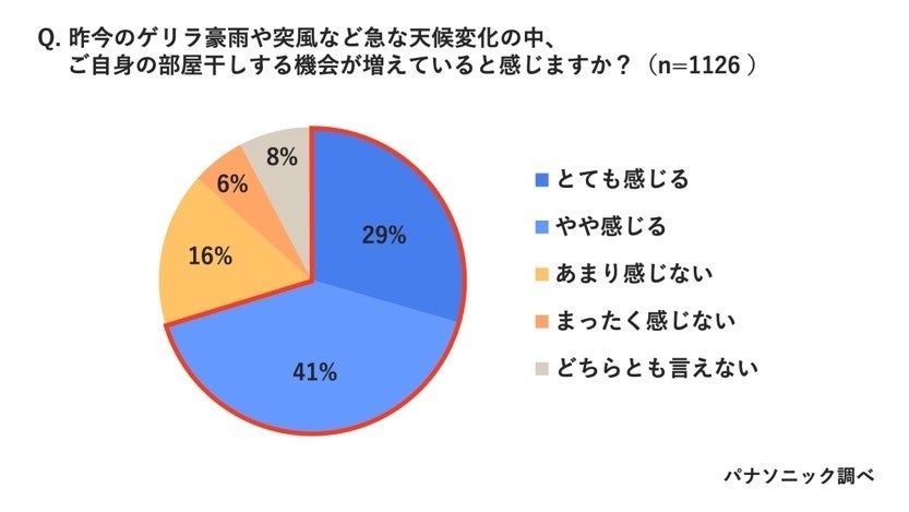続いて、洗濯物の干し方については、昨今のゲリラ豪雨や突風など急な天候変化で、70%が「部屋干しの機会が増えている」と回答しました。