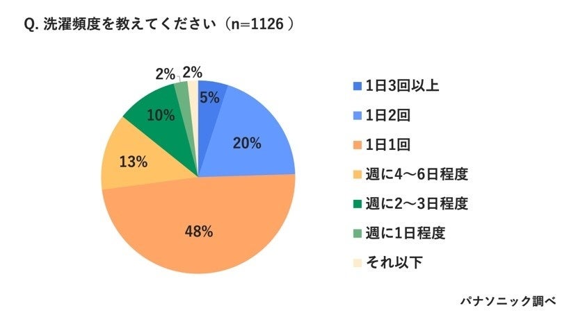 はじめに、各家庭の洗濯頻度についてたずねると、「1日2回」が20%という結果に。さらに、中には「1日3回以上」(5%)という方もいて、4人に1人は洗濯頻度が「1日2回以上」であることがわかりました。さらに、「1日1回」の48%を加えると、73%が毎日洗濯をしています。