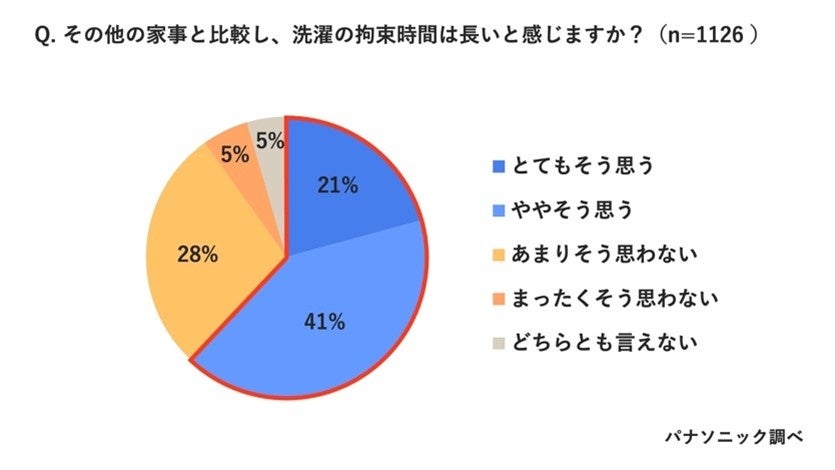 「その他の家事と比較し、洗濯の拘束時間は長いと感じますか?」という質問では、「とてもそう思う」(21%)、「ややそう思う」(41%)と、62%が洗濯は家事の中で拘束時間が長いと感じているようです。