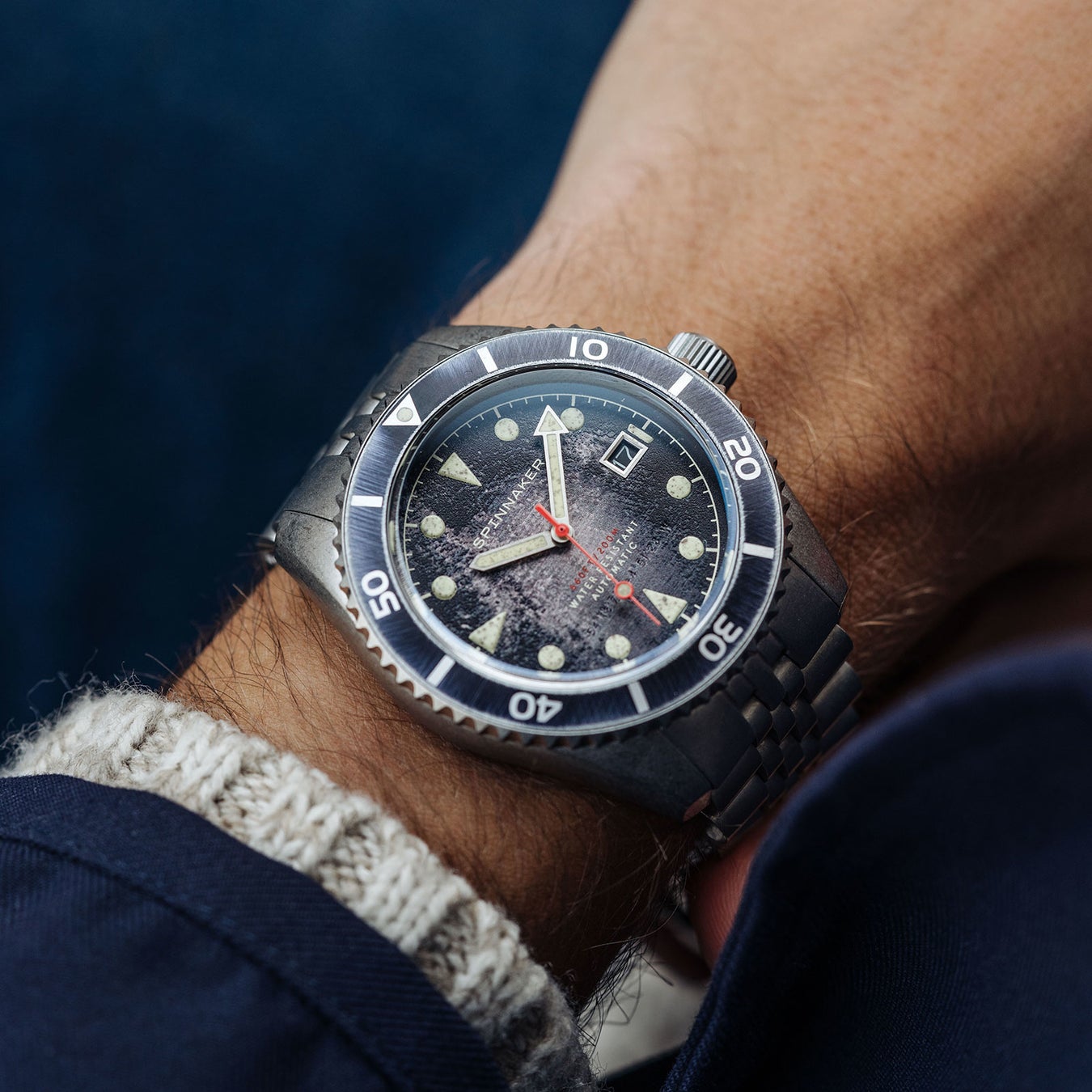 『レック(WRECK)』は、ケースやベゼル、針、インデックスなど、各パーツにヴィンテージ加工を施したダイバーズウォッチ。海の荒波に揉まれた人工物を再現するために、火炎を噴射する"ブロートーチ"や、希薄な酸液中に浸す"酸浴"などを行い、手作業で処理されています。