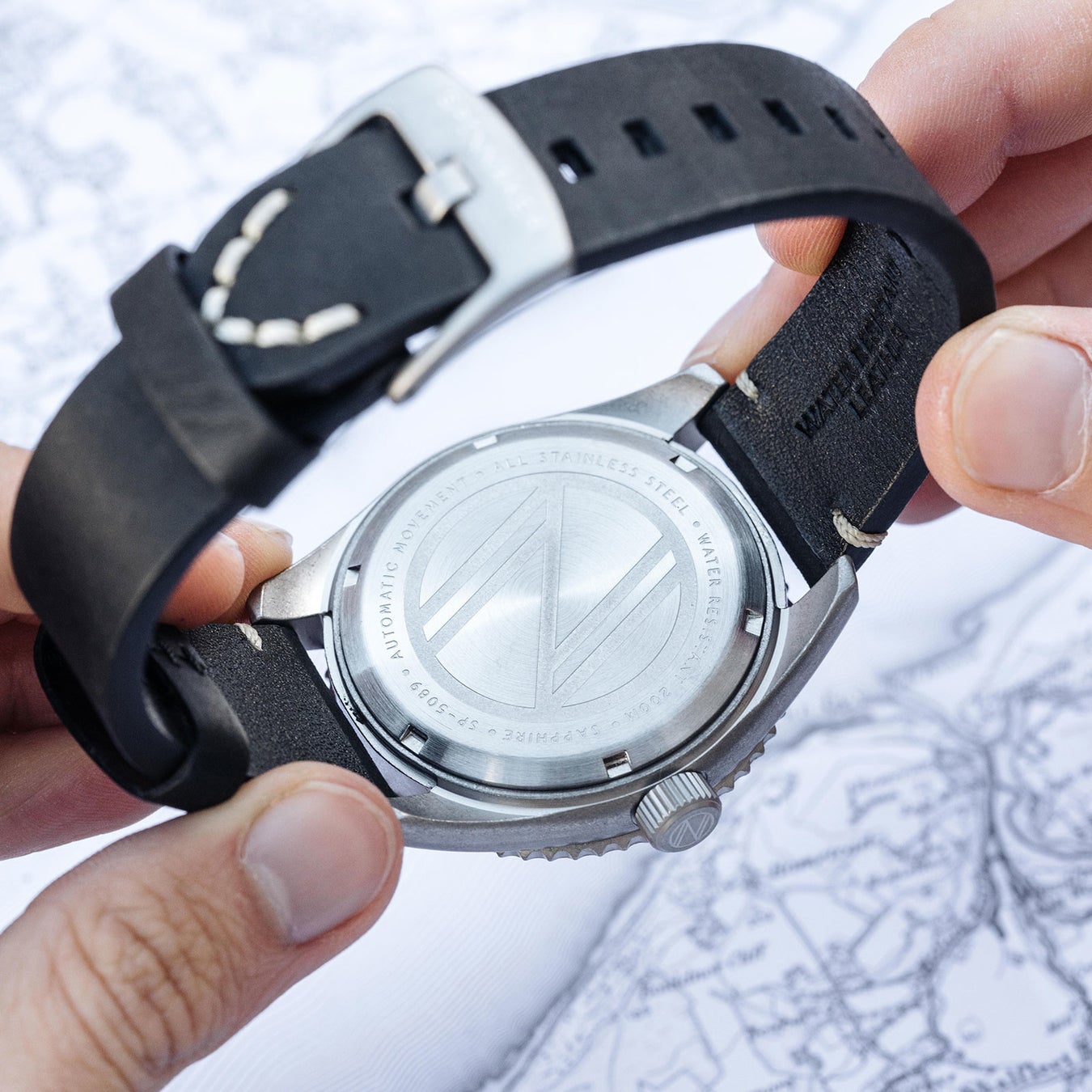 ムーヴメントは日本製の「NH35」、風防は強度と透明性に優れた「サファイアクリスタル」、針とインデックスはスイス製の蓄光塗料「スーパールミノーバ」を採用。
