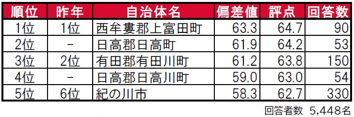 紀伊半島西部沿岸に位置、「産湯海水浴場」や「熊野古道」など豊かな自然に囲まれている日高町と、3つの町村が合併し、県内で3番目に広い面積を有する日高川町は、いずれも日高郡に属する町です。昨年は累計回答数が50名未満だったためランキング集計対象外でしたが、今年はトップ5入りしています。
