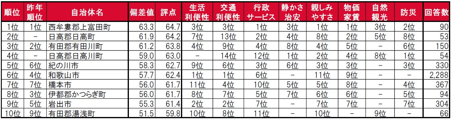 街の住みここちランキング2023<和歌山県版>自治体TOP10 因子別順位