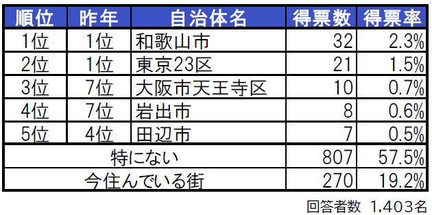 和歌山市が2年連続で1位、昨年同率1位だった東京23区が2位です。3位は、昨年7位だった大阪市天王寺区という結果になっています。