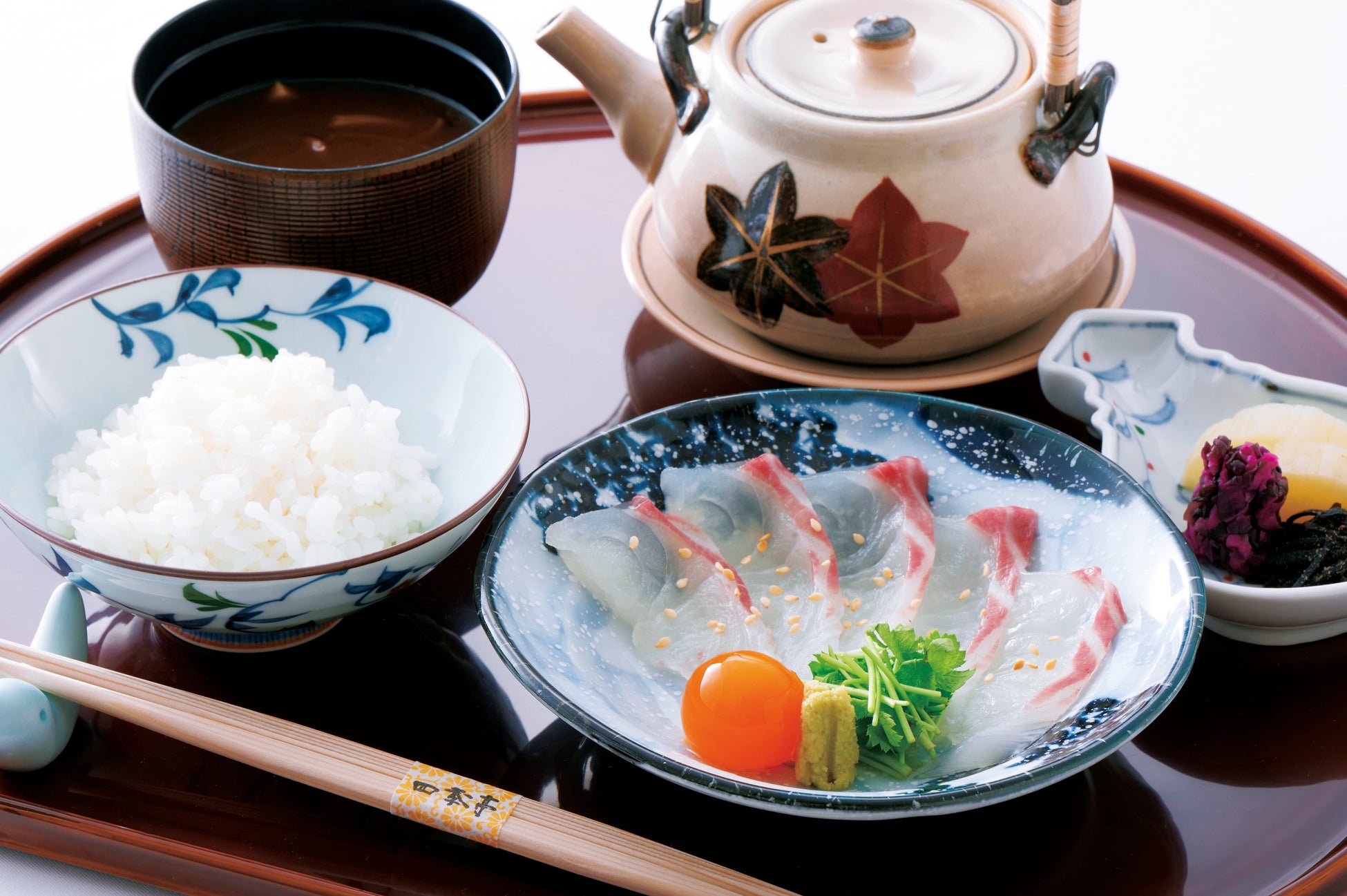 鯛の骨からとった出汁で炊いた鯛めしは、まずは鯛の旨みをたっぷり吸ったご飯をお召しあがりください。次は、ごま醤油で和えた鯛の切り身をのせて、熱々の出汁を注ぎ、一味も二味も違う鯛めしをお楽しみください。