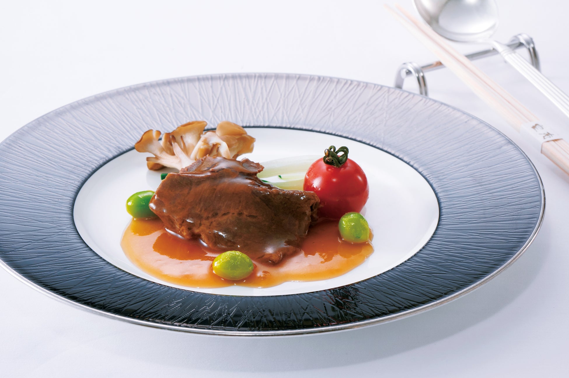 牛頬肉の紹興酒煮込み 広東白菜添えは、箸で切れるほどじっくりと煮込み、陳皮の爽やかな香りをアクセントに効かせました。添えた広東白菜のシャキシャキとした食感とともにお召しあがりください。