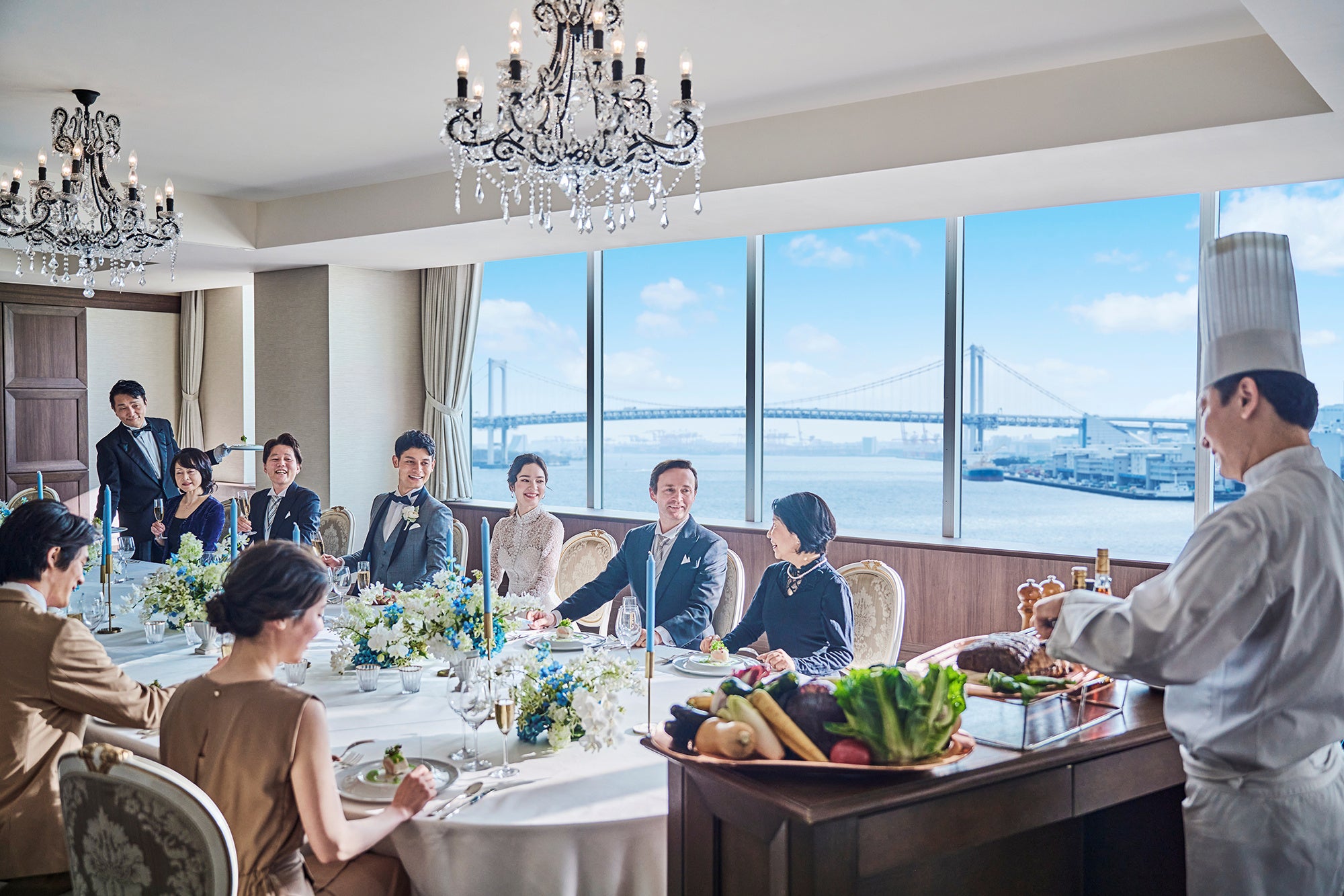 海を臨む抜群のロケーションとシェフのパフォーマンス付き料理で、非日常の空間と美食を楽しむラグジュアリーウエディング。複数の専用会場を用意。