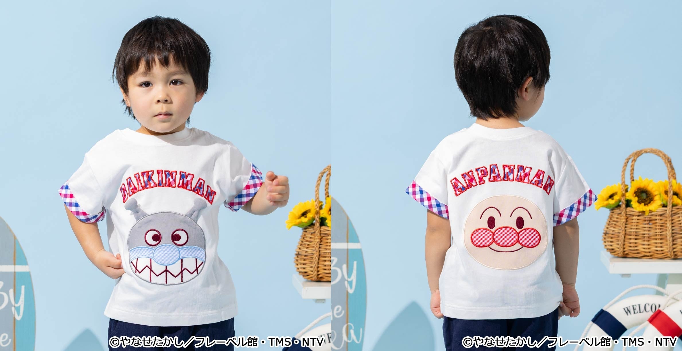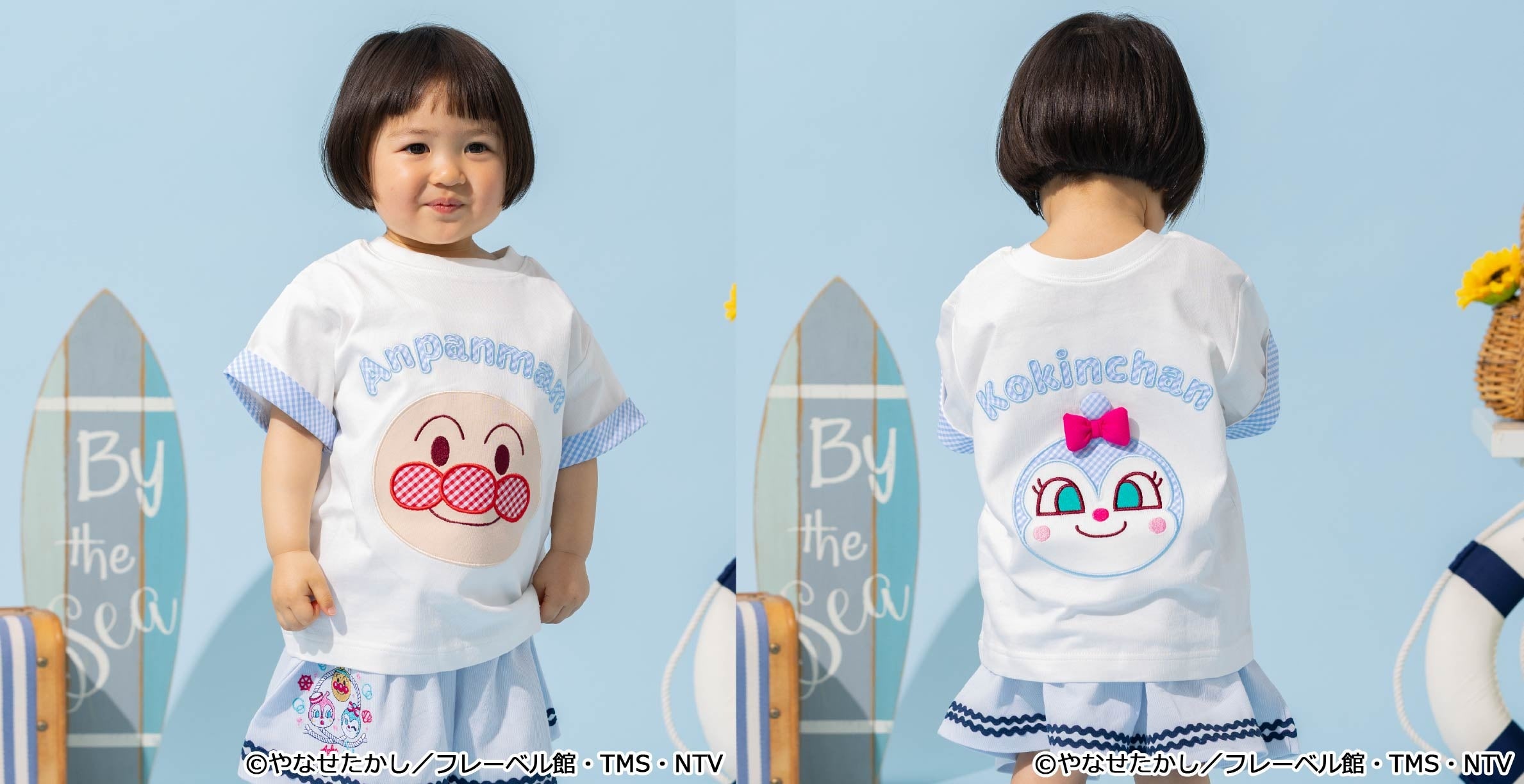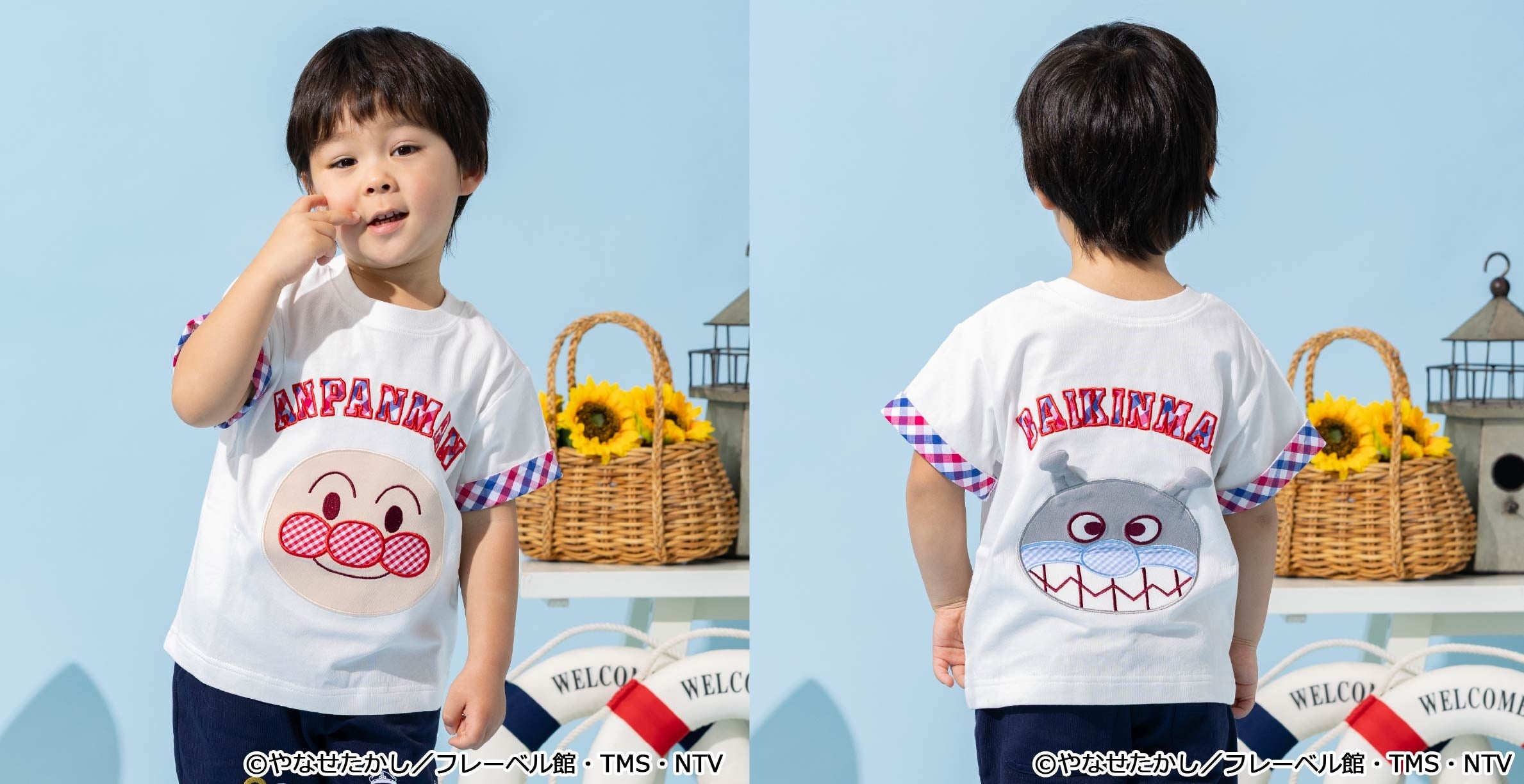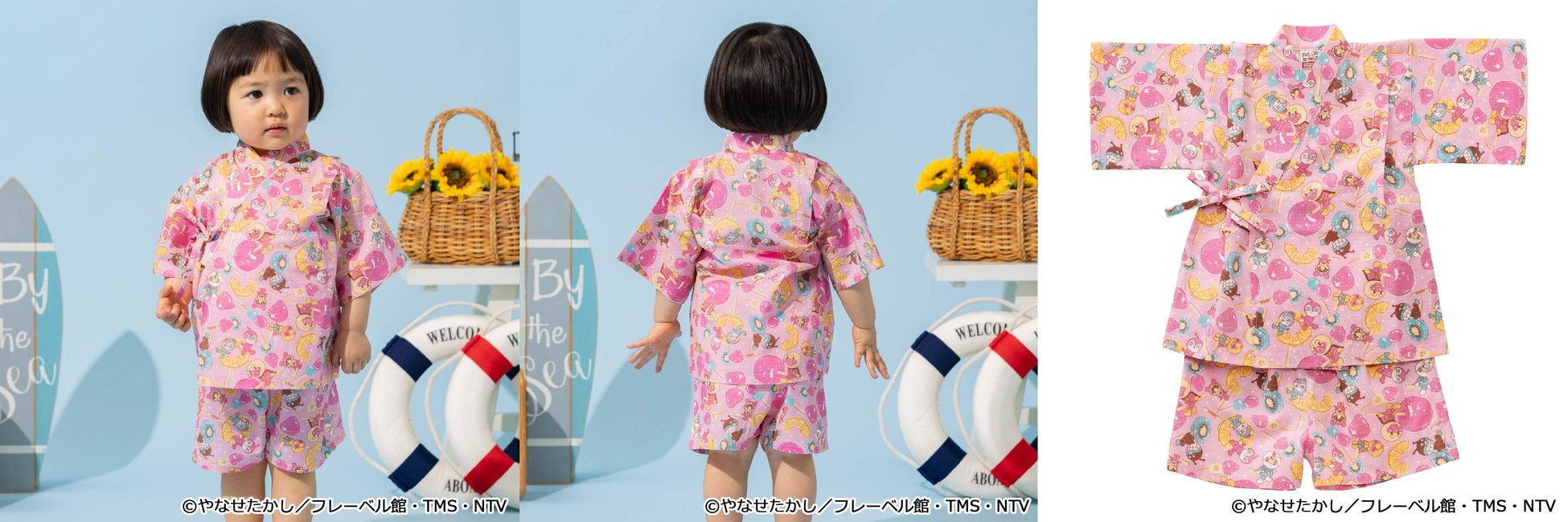 マリンルックのアンパンマンたちがデザインされたTシャツをはじめ、前後2WAYで着られるTシャツ、甚平やスイムグッズなど夏のおでかけがわくわく楽しくなるアイテムが続々登場!