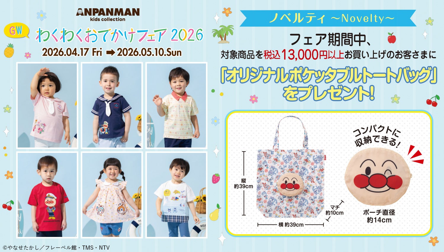また、商品の発売にあわせて、店頭およびバンダイナムコグループ公式通販サイト「プレミアムバンダイ内アンパンマンキッズコレクションオンラインショップ」( https://p-bandai.jp/anpanman-kids/ )にて対象商品を13,000円(税込)以上お買い上げのお客様に「オリジナルポケッタブルトートバッグ」をプレゼントするキャンペーンを実施いたします。