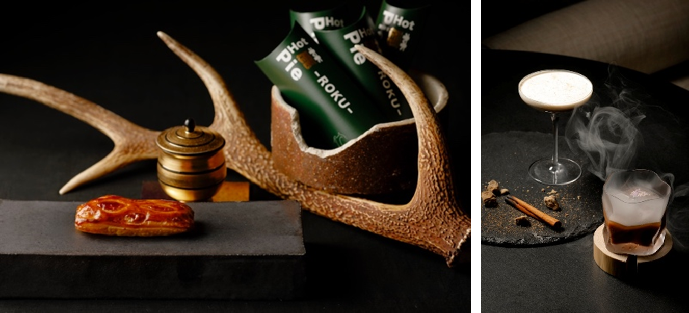 静寂に包まれる「山麓の冬の夜」をモチーフにしたシックな佇まいのカクテル2種をご提供します。ピート香が効いたウイスキーを用いたアイリッシュコーヒーに、燻らせたシナモンと黒糖の香りをそっとまとわせた「ROKUアイリッシュコーヒー」、そして紅茶とダークラム、チョコレートの風味を重ねた「ミッドナイトソナタ」は、烏龍茶と米をスモークし、豊かな薫香を添えてお届けします。蓋を開けるとグラスの中から煙がふわりと立ち上り、幻想的な光景が広がります。