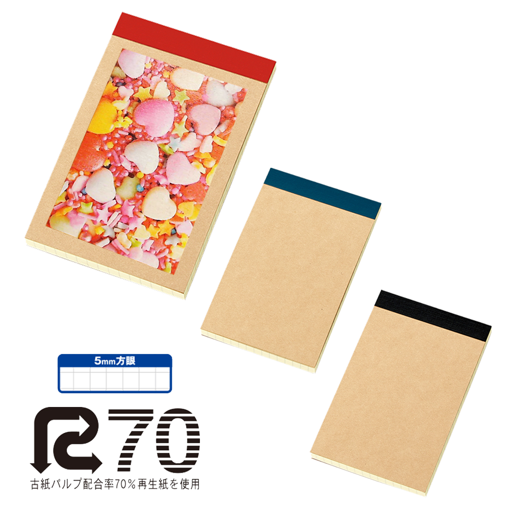 本文には5㎜方眼用紙を採用しており、文字だけでなく図やラフスケッチも書きやすい仕様。再生紙ならではのやさしい風合いと落ち着いたカラーが特徴で、環境にも配慮したアイテムです。古紙パルプ配合率70%のR70マーク取得製品で、サステナブルな取り組みにも貢献します。
