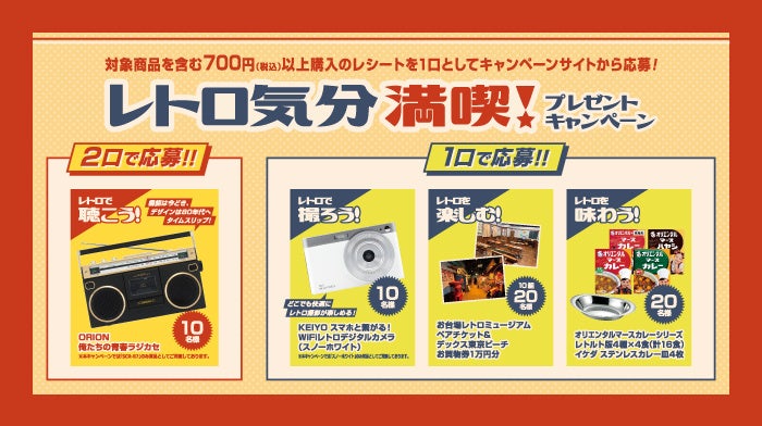 期間中は、「レトロフェア」対象商品1品以上を含む、700円(税込)以上ご購入のレシートに発行されるIDでご応募いただくと、「ORION 俺たちの青春ラジカセ」やレトロ気分を満喫できる賞品が抽選で当たるプレゼントキャンペーンを実施いたします。