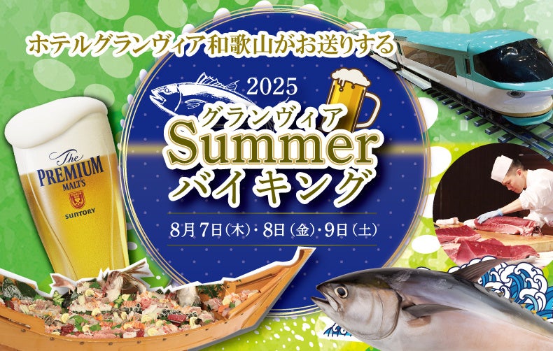 和歌山ターミナルビル株式会社(和歌山市友田町、代表取締役社長 武田雅夫)が運営するホテルグランヴィア和歌山は、夏を彩る宴会イベント「グランヴィアSummerバイキング」を8月7日(木)から9日(土)の期間限定で開催します。本イベントでは、まぐろの一本造りや国産牛フィレ肉の鉄板焼きなど、和洋折衷の多彩な料理に加え、ザ・プレミアム・モルツを含む飲み放題をお楽しみいただけます。そして、お子様向けにはJR西日本こども制服での写真撮影会や、9日限定の「ミニトレインオーシャンアロー号乗車体験」を予定しています。
