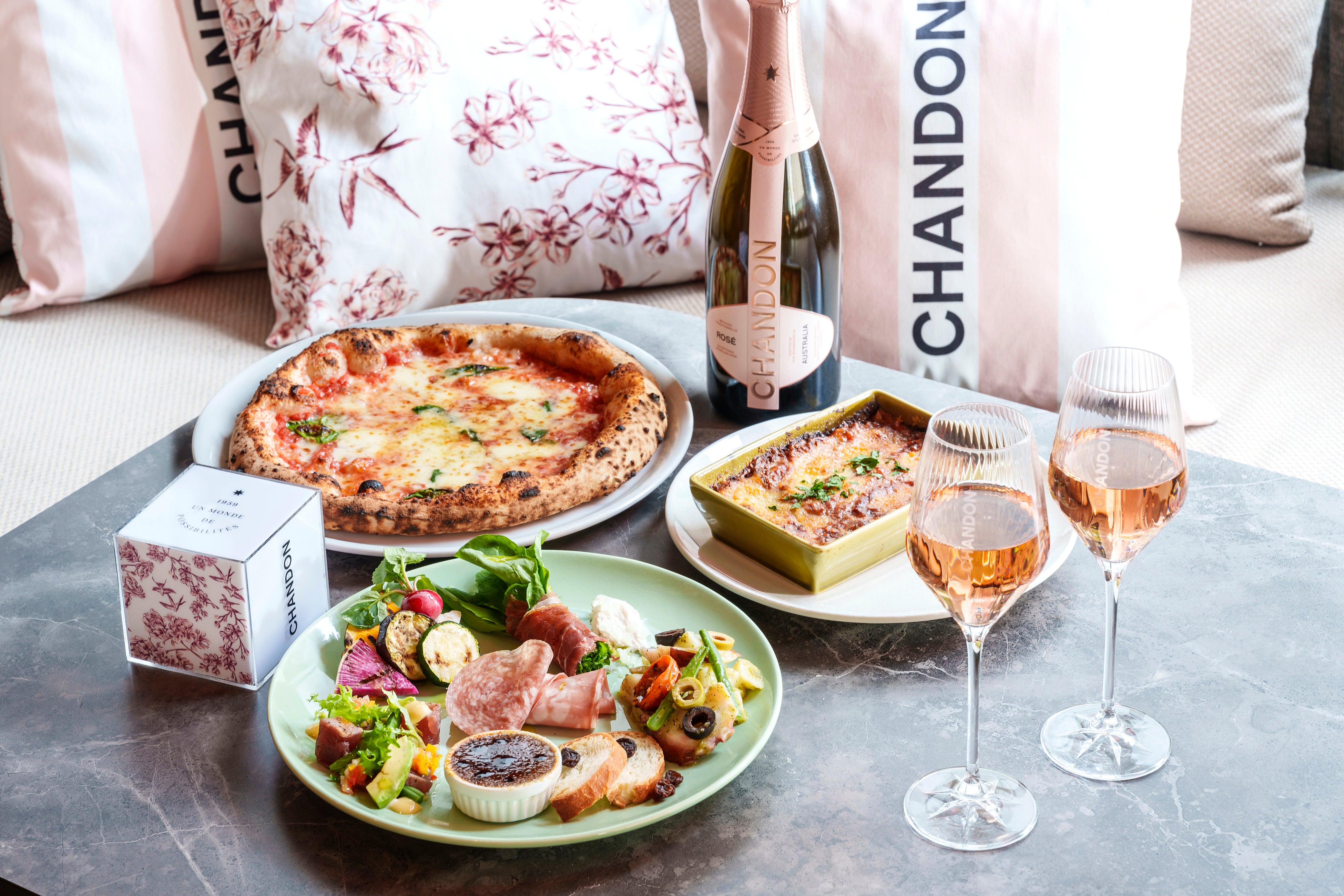 桜モチーフのクッションやファニチャーを配した華やかでエレガントな雰囲気のテラスで過ごすお二人にぴったりな「CHANDON ROSÉ & Party Set」は、「シャンドン ロゼ」2杯に薪窯で焼き上げる本格ナポリピッツァやラザーニャ、さらにフレッシュで味わい豊かな前菜7種までを堪能できる贅沢なセットです。他にも「シャンドン ロゼ」にナポリピッツァや春限定「桜と苺、抹茶のパフェ」などを合わせた全4種類の限定セットをラインナップいたしました。